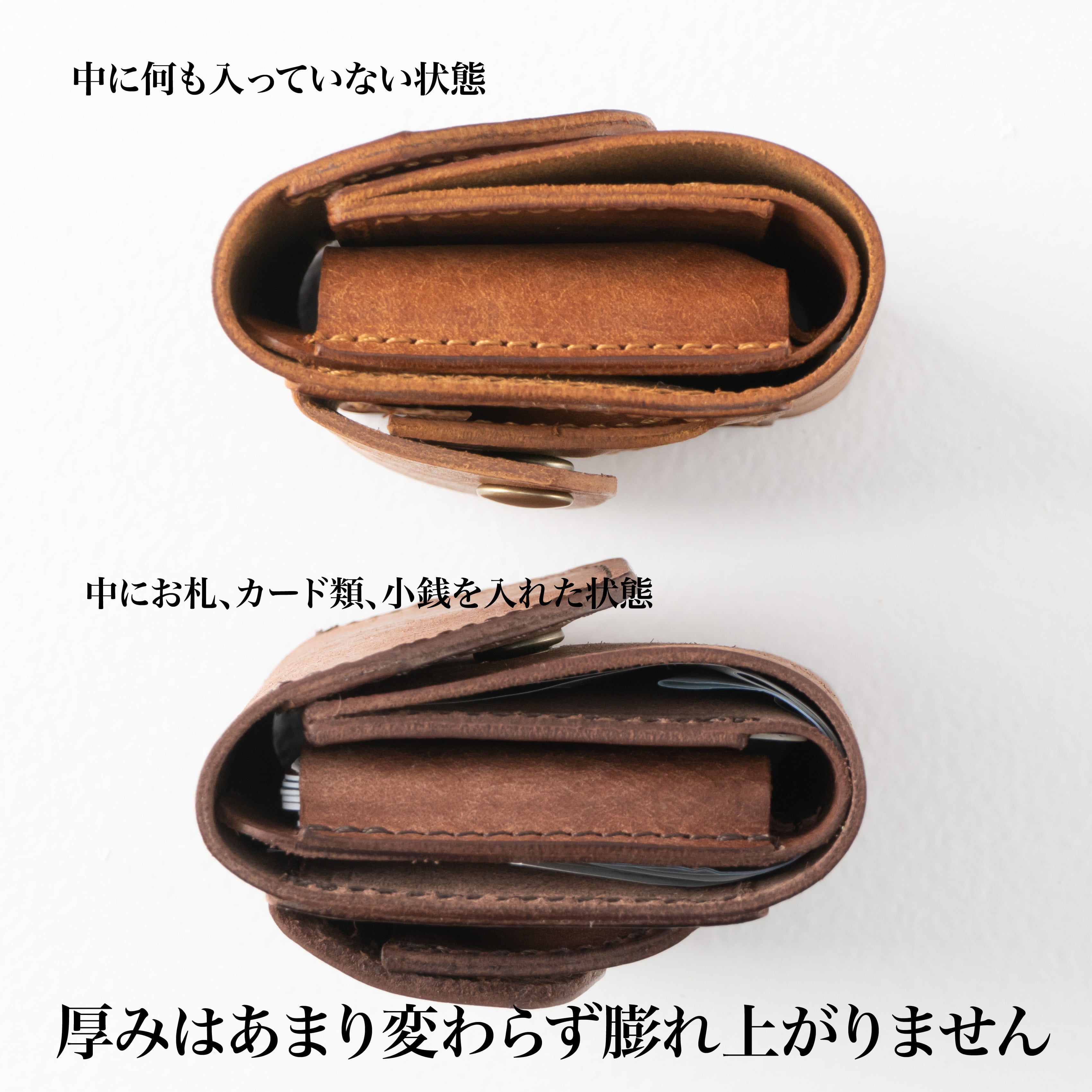 上が何も入っていない状態で、下がお札やカード、小銭などを入れた状態です。